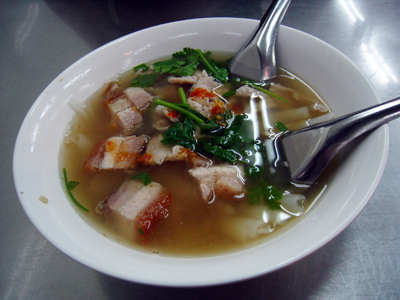 Kuay Chap is made of flat white rice noodles, but the noodle is rolled like a thick straw. I don't know how they do it. The soup is really peppery hot and tastes very, very gooood!!! Normally this noodle soup will be served with all kinds of meats (intestines, liver, heart, lungs) but if you are not a fan of internal organs, ask for pork only... Here we have crispy pork (Moo Grob) and normal pork meat.